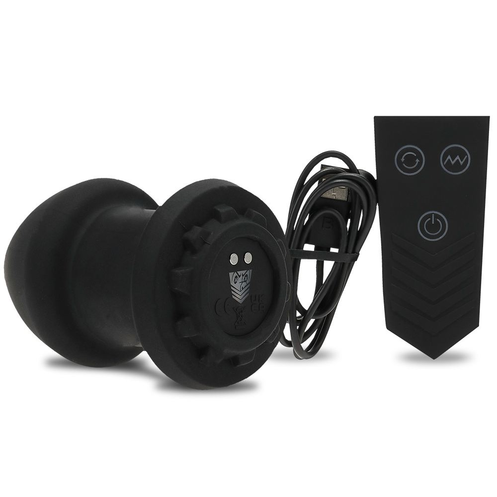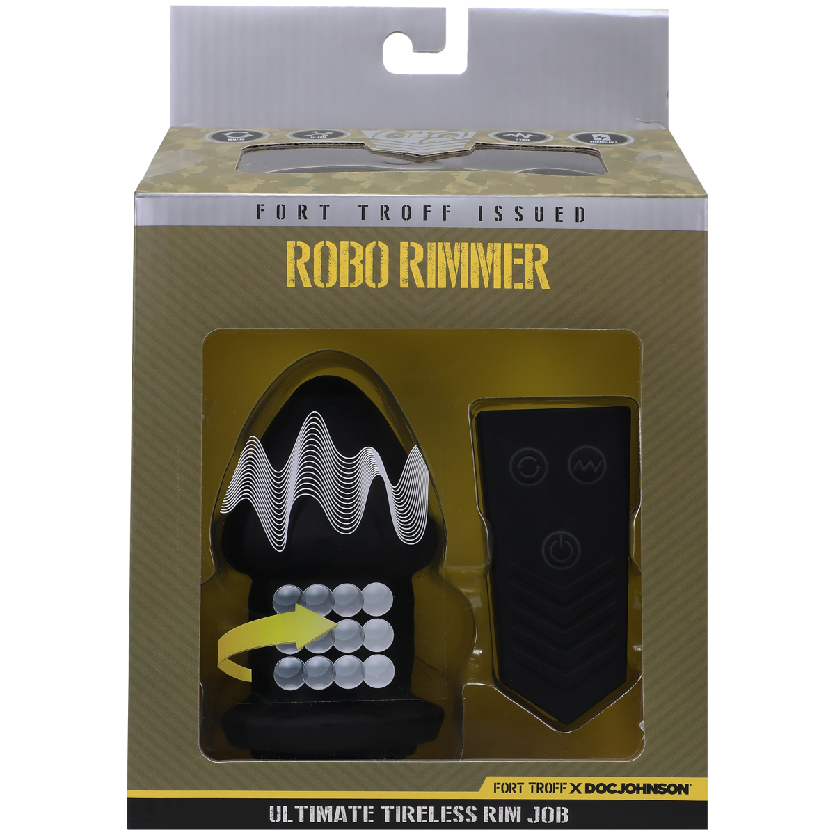 A mechanical tongue that wont tap out. Spread your cheeks for the Robo Rimmer X. This dual-engine plug delivers sensation as it goes in AND once youre plugged. The fat n cushy head is tapered for EZ entry. It delivers 8 vibe patterns so you enjoy the ride. Once youre in buckle up for the rim job of your life. Bold n strong ridges rotate and caress your sphincter with 5 rimming patterns. Control the tip vibe and the swirlin lick with the included remote. Approximate Product Dimensions: Rimming PlugTotal Length: 4.5 in. (11.4 cm)Insertable Length: 4 in. (10.2 cm)Width/Diameter: 2.5 in. (6.4 cm)Circumference: 8 in. (20.3 cm)