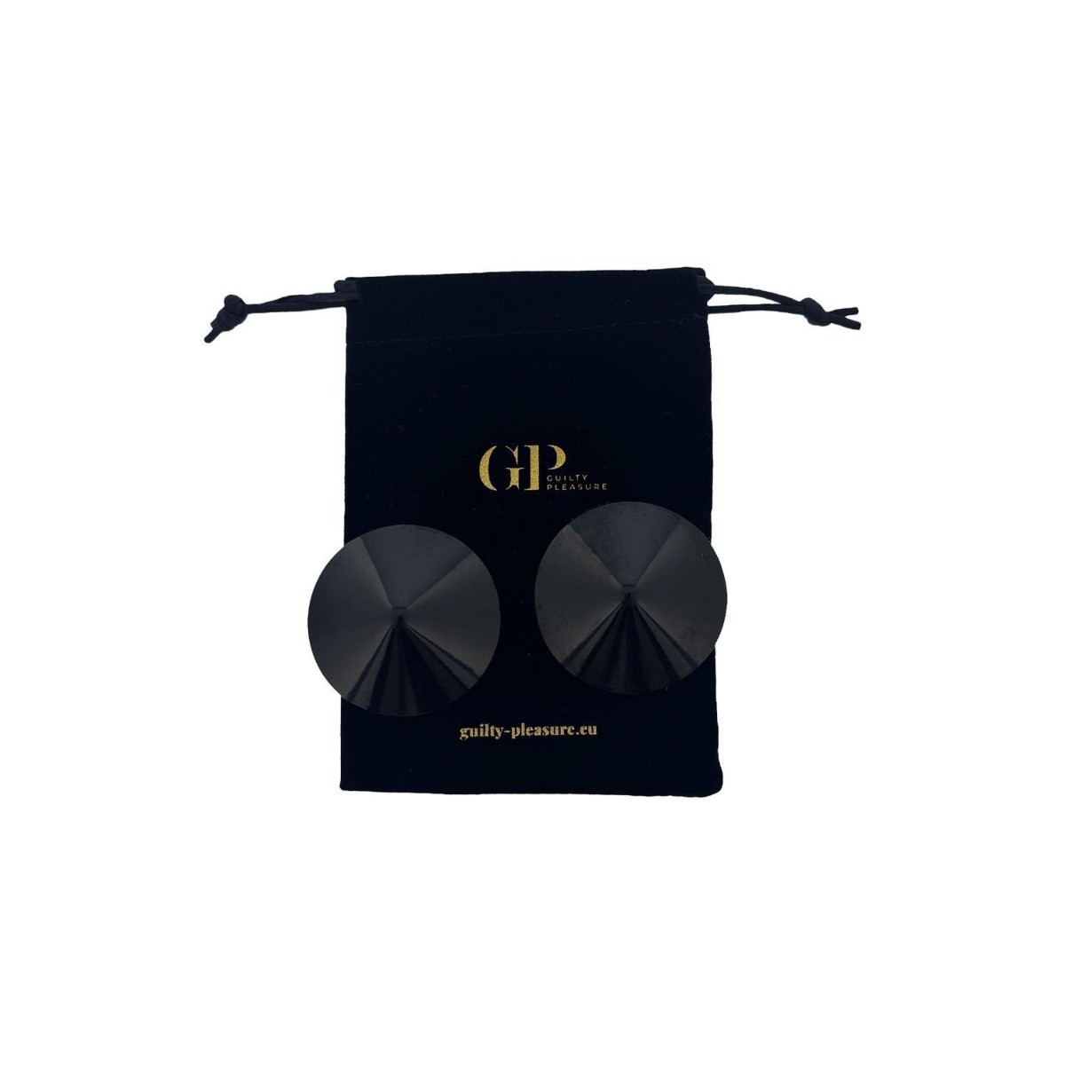 A striking statement in lustrous black sculpted to seduce. Bold unapologetic and effortlessly elegant the black Tempting Touch Covers bring an edge of refined provocation to any look. Crafted from polished black metal with a sleek pyramidal design they capture and reflect light with every movement drawing attention in all the right ways.Perfect as a sensual detail beneath lingerie layered with sheer styling or worn boldly on bare skin these lightweight covers are as versatile as they are captivating. The reusable design ensures longevity while 20 included self-adhesive strips make for easy secure wear time and time again.Designed to accentuate empower and entice the black Tempting Touch Covers offer a commanding presence in a minimalist form. A subtle nod to dominance a full declaration of confidence.