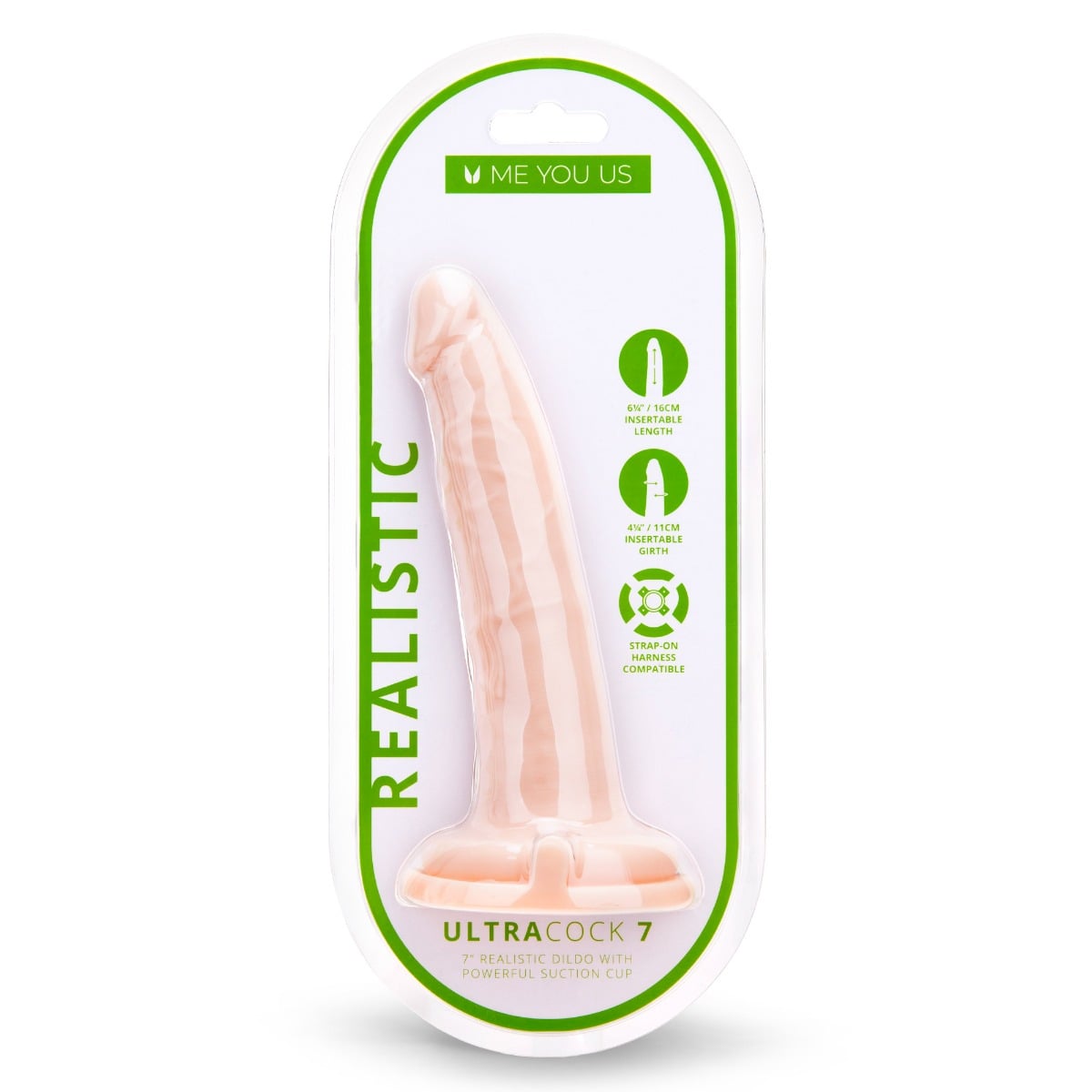 Me You Us Ultra Cock 7″ Realistic Dildo with powerful suction cup7 Realistic Dildo with Lifelike Detail for an Authentic Experience is made of sturdy but soft body-safe PVC providing a soft experience to fill you up and satisfy all of your needs.This Ultracock 7 by Me You Us includes a bulbous head realistic veins and a slight curve for realistic pleasure.The flared base makes the dildo safe for both Vaginal and Anal penetration while the sturdy suction cup base provides stability during the wildest of solo play.The powerful suction cup is also great for use in the bath shower or any hard flat surface for hands free play as well as in a suitable Harness.DetailsSturdy Suction CupTab for Easy RemovalSoft Body-Safe PVCPhthalate FreeLifelike detailsHarness Ready