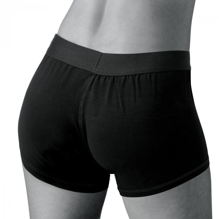 Feel more comfortable and stylish than ever before when you strap on your favorite dildo. This boxer brief style harness feels just like underwear with an O-ring that stretches to accommodate most dildo sizes. You can even wear these cotton shorts out under your clothing or stuff them with your favorite packer. This harness is excellent for extended wear. The supportive elastic waistband will carry the weight of your dong and you will be allowed greater mobility and position versatility. This harness is recommended for use with dildos that have a flat base that is 1.75 inches or wider. Machine washable.Measurements: Waistband measures 13 inches in diameter unstretched. Legs of shorts are 9.5 inches in length unstretched. O-ring is 1.5 inches in diameter unstretched.Material: Cotton spandex rubber.