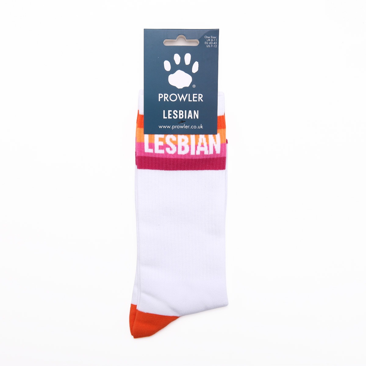 The Prowler Lesbian Socks in white purple and orange are a fun and colourful way to show support for the LGBTQ+ community. These socks feature a bright design that stands out making them a great accessory for anyone wanting to express pride. The combination of white purple and orange not only looks stylish but also represents inclusivity and love. They can be worn with casual outfits during Pride events or even just at home for a cozy day. Whether you’re looking to brighten up your wardrobe or share a message of acceptance these socks are a perfect choice!