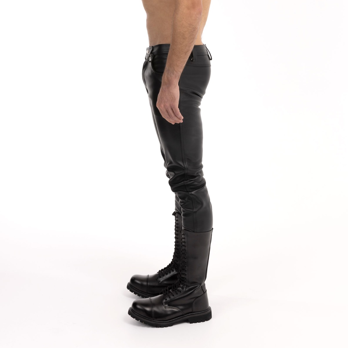 These are the staple leather jeans. A simple 501 cut in amazing soft leather.Two deep pockets on the front a double snap button to keep them secure and a zip fly to avoid any button mishaps.We left the pockets off the back of these jeans so they can really show off how well they will fit around your ass.We make our jeans higher waisted to stop that feeling of them constantly falling down but we still recommend wearing a belt.All our leather jeans are finished to a 36″ leg but alterations to the length can be made free of charge in our store.