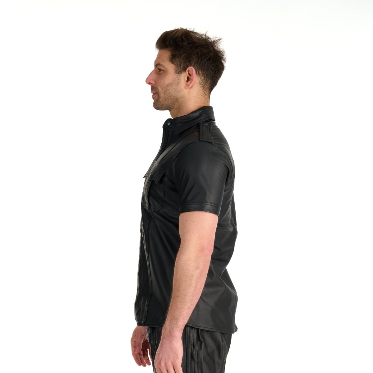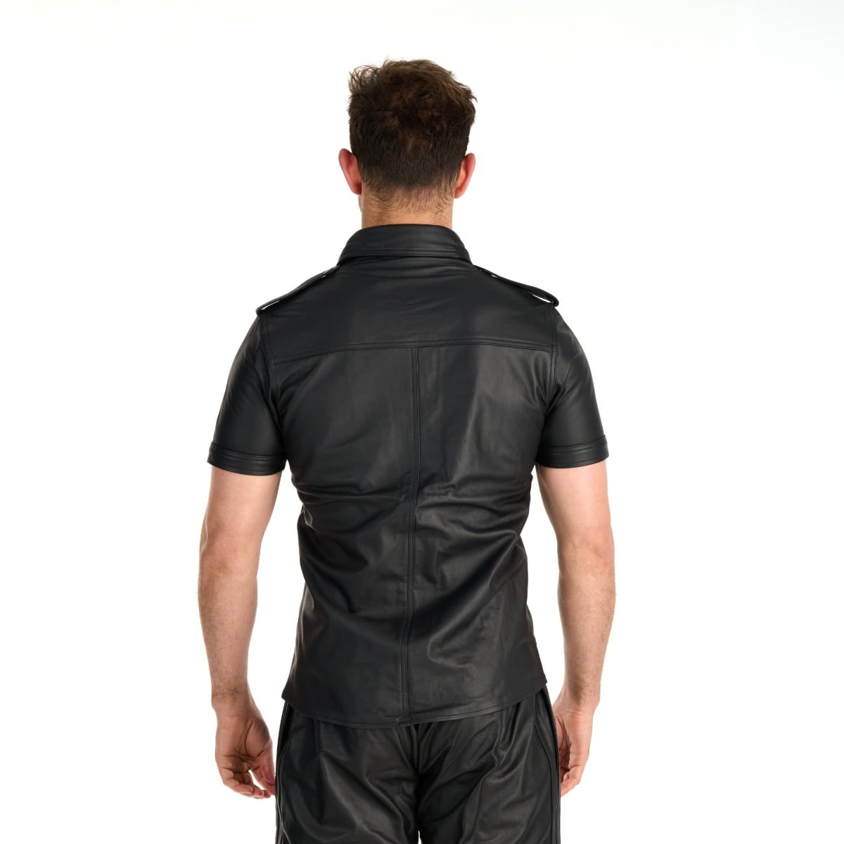 The Prowler Red range leather police shirt is a sharply tailored garment made from quality leather. All black or available in black with grey or red piping details. Features: – Classic Fit- Police Style Breast Pockets and Shoulder Epaulettes- Press Stud fasteners- 100% Leather Sizes: SMALL: CHEST 38-40 inch / 96-100 cm COLLAR 17 inch / 43 cmMEDIUM: CHEST 40-42 inch / 100-108 cm COLLAR 17.5 inch / 44.5 cmLARGE: CHEST 42-44 inch /108-112 cm COLLAR 18 inch / 45.75 cmXLARGE: CHEST 44-46 inch / 112-116 cm COLLAR 18.5 inch / 47 cm