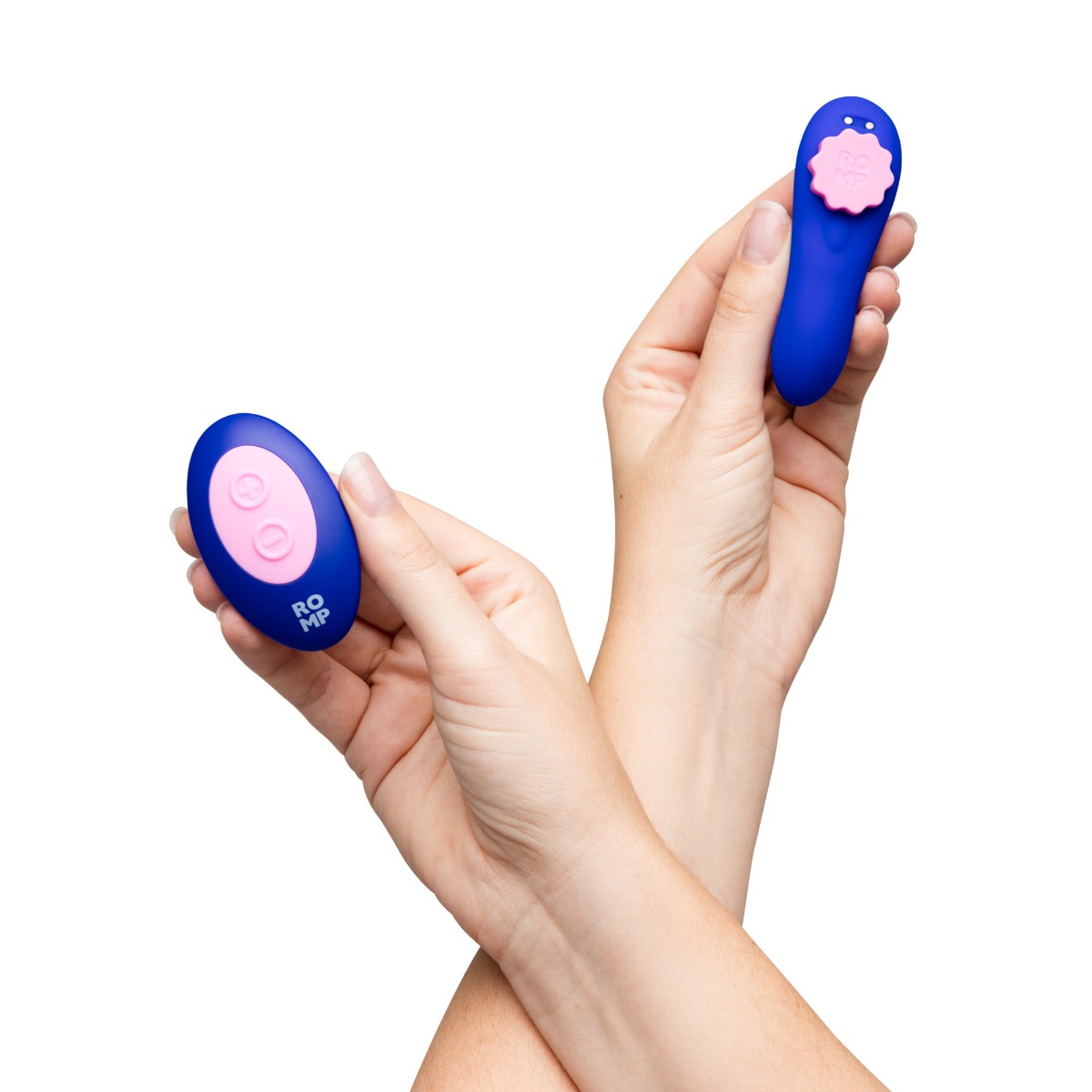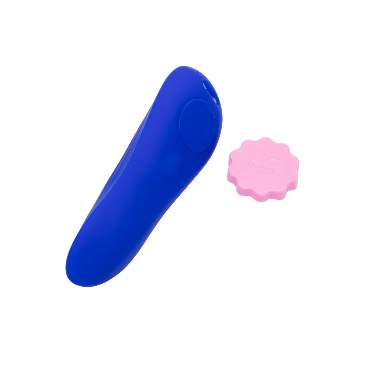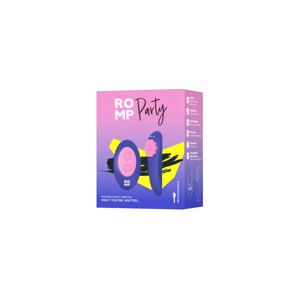 ROMP Party is a remote-controlled panty vibrator designed for on-the-go clitoral stimulation. With 7 intensity levels this discreet treat easily snaps into place for kinky adventures in solo and partnered play.ControlTwo buttons on the toy one button on the remoteTypePanty VibratorColorPurpleDimensionsLength: 87.4 mm Width at the largest point: 28.9 mmMaterialsBody-Safe SiliconeBatteryLi-polymerRun TimeProduct: 60 min Remote: 5 hoursCharge TimeRemote: 80 min Remote: 60 minCharger typeUSB charging cable (AC adapter not included)WaterproofIPX7 waterproofWarranty2 years